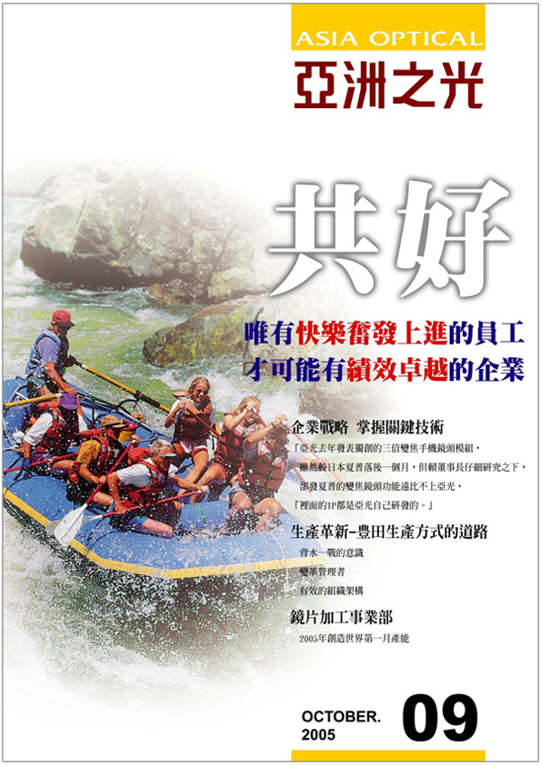 從一片單純的鏡片研磨,到各式鏡頭、數位相機的ODM,我們靠著不斷的創新與精進,終於建立起在光學產業的一片天空;除了客戶給予我們的機會與嚴格要求,鞭促我們不斷成長外,各位員工的努力更是我們得以一步步躍向國際舞台的主要動力;然而這種毛利率下降的困境恐將是許多代工業者無可避免的未來,如何在「微利時代」中創造高獲利,就看各廠商如何發展出一套的逆境中求成長的營運模式。